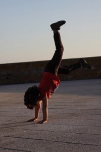 Leyre juega haciendo acrobacias, esperando la puesta de sol.
