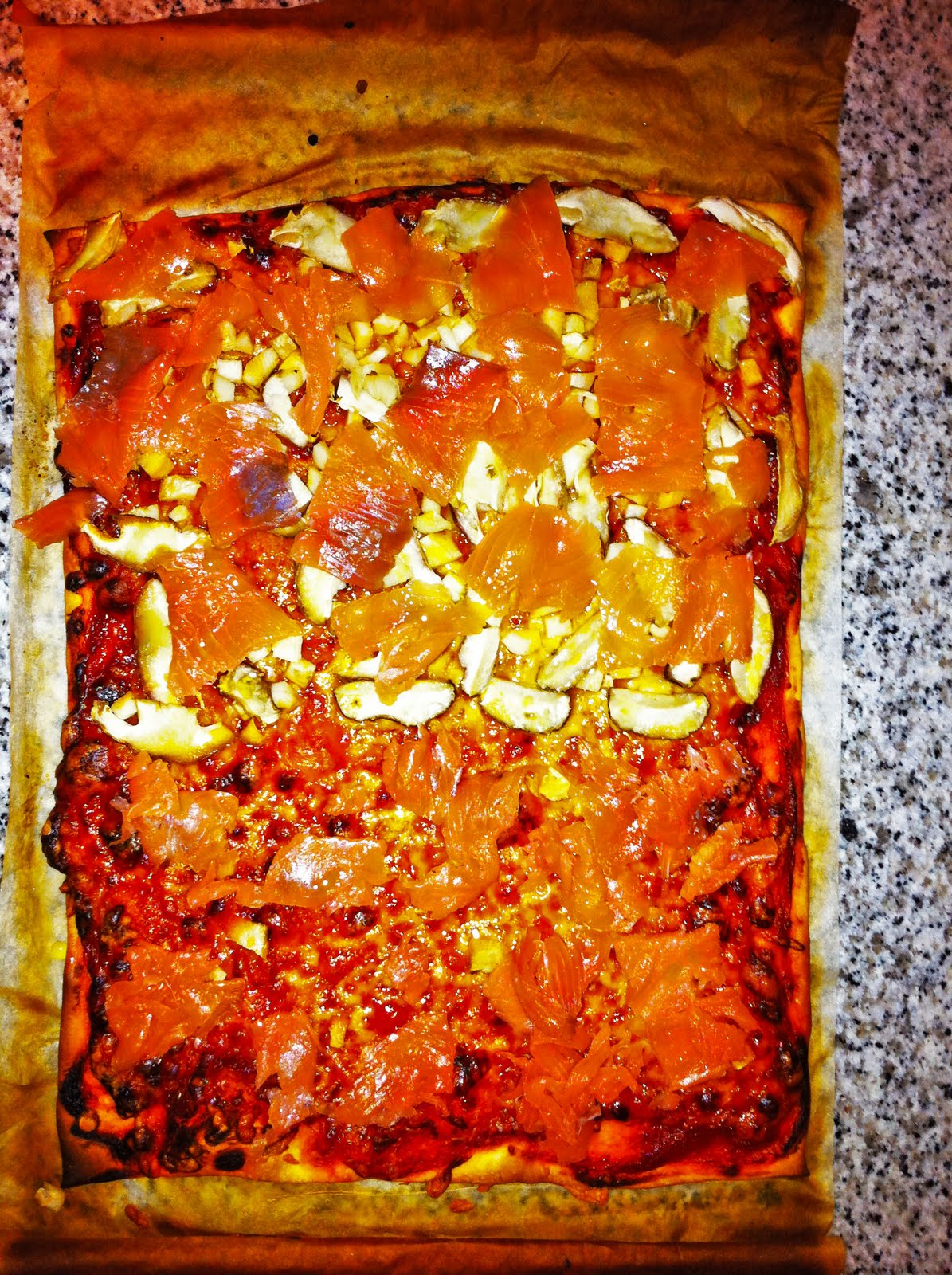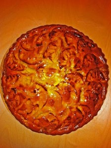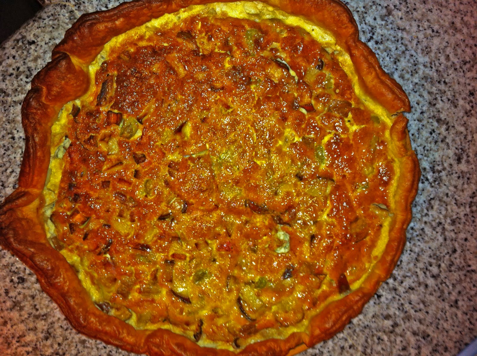 Quiche de cebolla, lacón, aceitunas y Boletus.