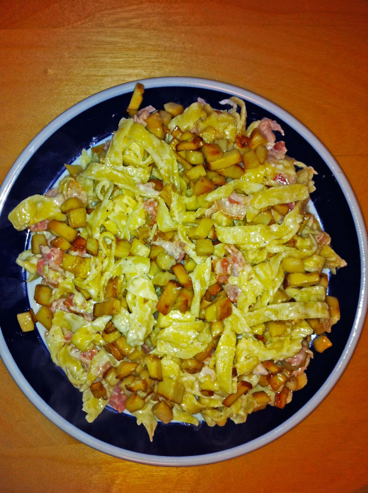 Tallarines con bacón, nata y pimienta, acompañados de Boletus salteados en aceite de oliva virgen y sal.