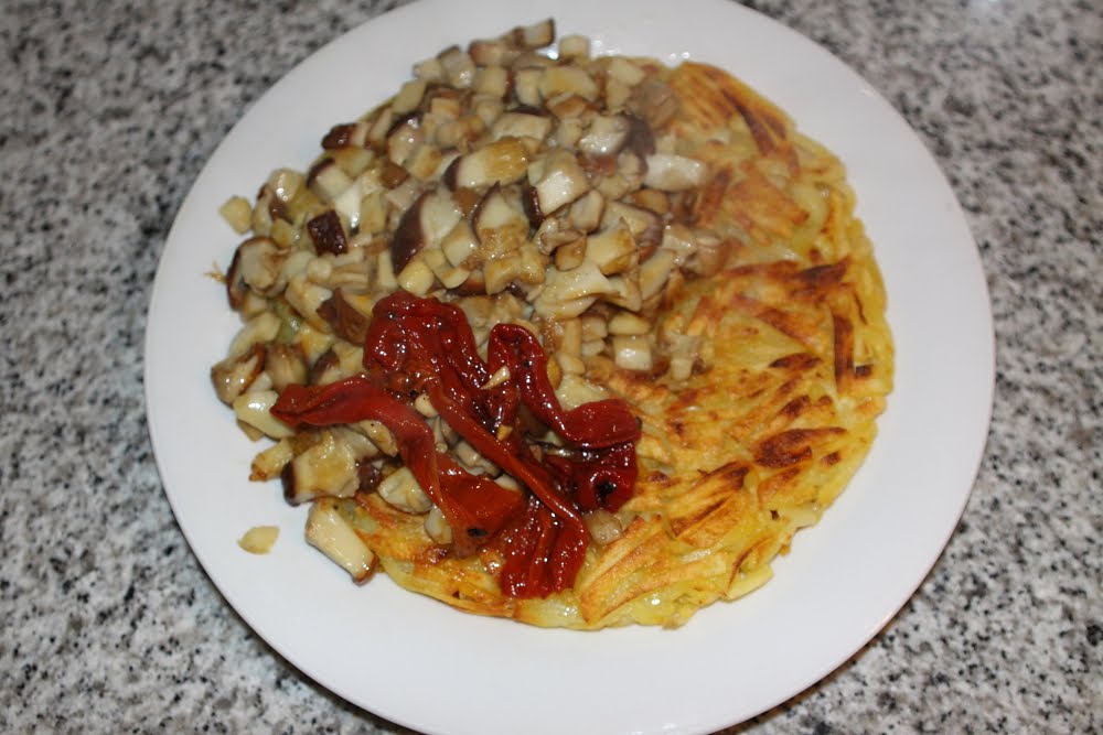 Base de patatas paja tipo torta, acompañada con boletus salteados con aceite de oliva virgen y pimientos de Cristal de Calahorra.