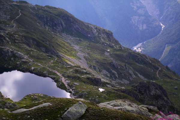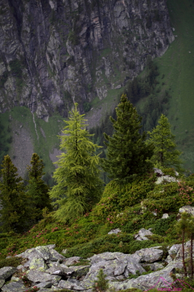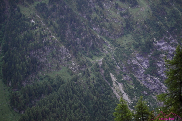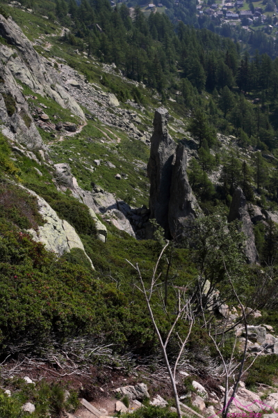 Comienzo a bajar hacia Tré-le-Champ, es una bajada larga, unos 1000m de desnivel, pasando del roquedo al bosque alpino. Camino sinuoso, entretenido, donde aparecen algunas escalas y pasos de manos para facilitar la bajada. Me cruzo con un grupo de «soldados» que deben estar haciendo alguna práctica o entrenamiento, suben lanzados, algunos van justos pero aguantan….