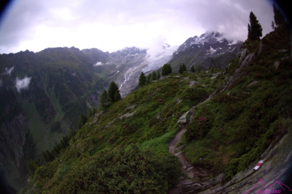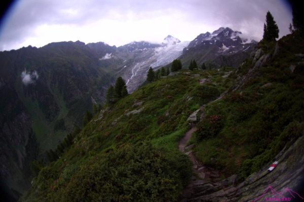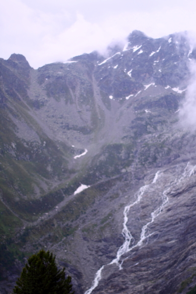 Llego a la cabaña Dessus, está frente al Glaciar du Trient, efectivamente ahí está la pareja, sorpendidos de verme y sin hablar ningún idioma que no sea el francés…Me dicen que NO SE PUEDE DORMIR…UFFFFF….Qué bajón!!! Me comentan que puedo ir al Col de la Forclaz, a más de 2h y perdiendo camino respecto al día siguiente…o también puedo ir a un vivac, pero sin saber el sitio exacto ni el nombre; esto no me lo esperaba, relleno en una fuente, que hay al lado de la cabaña, el bidón; tiro para abajo rápido, no quiero perder más tiempo en una cabaña preciosa pero lo único que iba a conseguir es sacarme dinero con alguna consumición… se ha puesto a llover fuerte, muy fuerte, bajo a resbalones, tropezones, empapado, los pies como los lagos de Covadonga y las piernas algo cansadas, es un camino muy empinado, difícil y escurridizo, no para de llover y cada vez con más fuerza, un par de caídas, la segunda algo más dura, me deja la pierna dolorida, unido a las ortigas que acompañan la bajada y los pies soltando agua, no es mi mejor día…