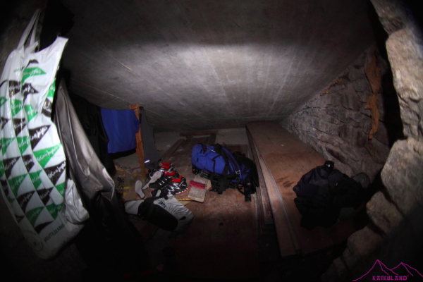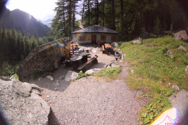 Hay un edificio más grande que es el bar y al lado otro mucho más pequeño donde están los aseos…justo encima de estos, por la parte de atrás hay una entrada tapada con unas tablas, que dan a un cobertizo pequeño, minimo, una especie de leñera…Aquí se puede dormir, pienso; hay unos tablones del ancho de una persona y de unos dos metros de largo colocados unos encima de otros, una especie de camastro muy incómodo pero que me servirá como «cama», decidido, no ando más…he dormido en sitios mucho peores y más incómodos, es un cobertizo moderno, de hormigón y dentro está bastante caliente, otra cosa son las arañas y ratones, compartiré con ellos cama. No está bien meterse en sitios privados, y, a pesar de tener tiempo para ir a otro sitio lo que no me quedan son fuerzas…me quedan muchos días…unas horas aquí, respetando lo que hay no harán mal a nadie. Tengo un sencillo bocadillo y 1 litro de agua mezclado con Flectomine (sales minerales y electrolitos) para recuperarme, he buscado alguna fuente de agua pero salvo el brutal arroyo que pasa al lado no hay nada donde pueda cogerla. Pongo un tendal improvisado dentro del habitáculo para secar un poco la ropa que llevo puesta, fuera hay una tormenta muy fuerte en las cumbres, vuelve a llover tras un ligero paréntesis de sol e incluso he podido ver el glaciar du Trient de nuevo y tirar algunas fotos.