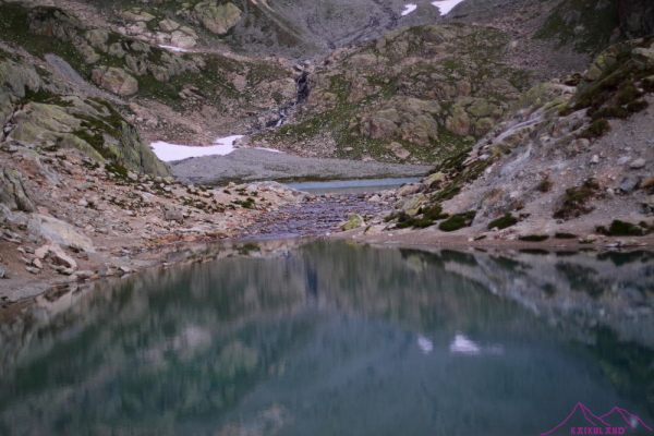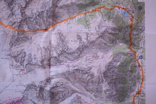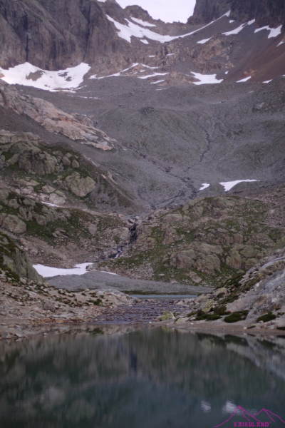 Voy hacia Les Grans para bajar al Chalet du Glacier, a ver si se puede dormir allí… Empieza a llover, hay tormenta, truenos, paro a rellenar el bidón de agua, por si acaso… Sigo a media ladera, bajando, alguna pequeña subida, me cruzo con unos vascos y pregunto si hay algún sitio para dormir, me dicen que si, a una hora hay una cabaña que se puede dormir, son las 15:30h, mucho tiempo andando y voy, ilusionado, pensando en la cabaña, me cruzo con unos catalanes y me dicen lo mismo, que sólo hay dos personas y que son los dueños, podré dormir tranquilo casi sin gente…