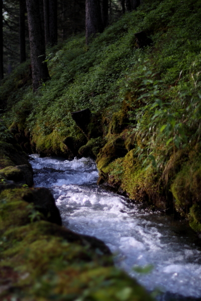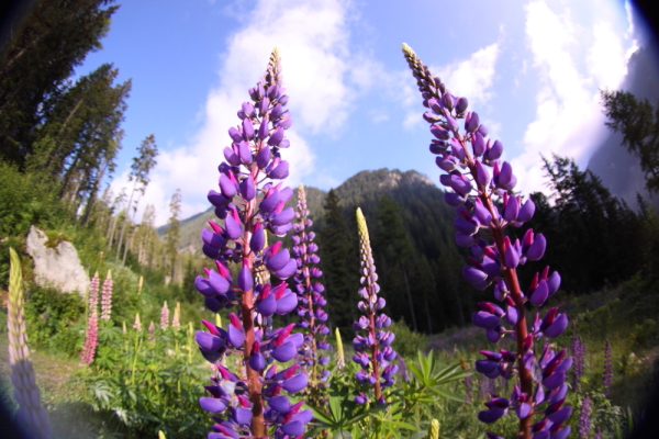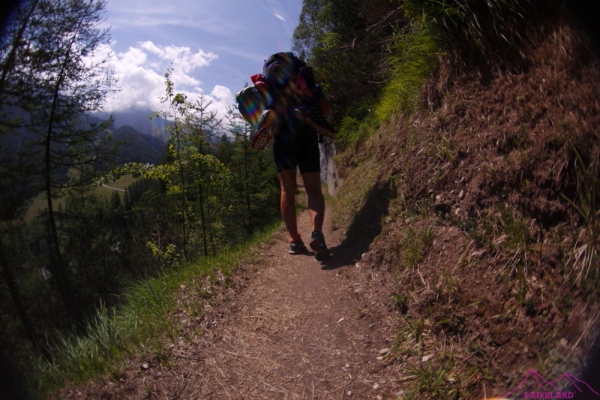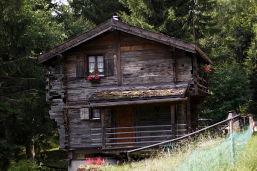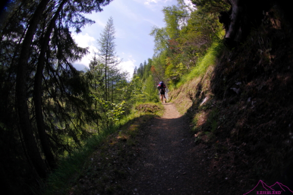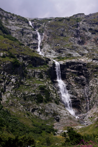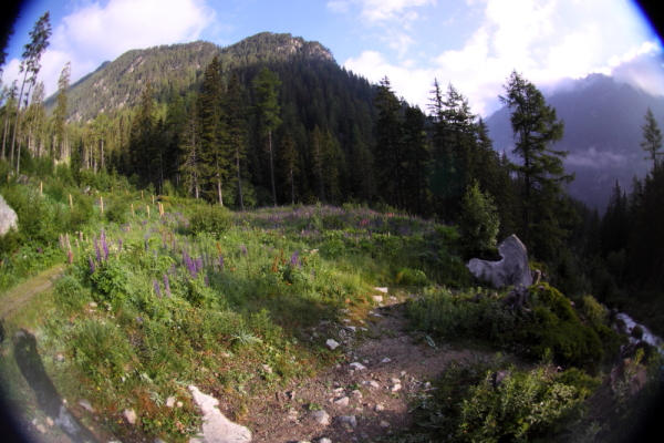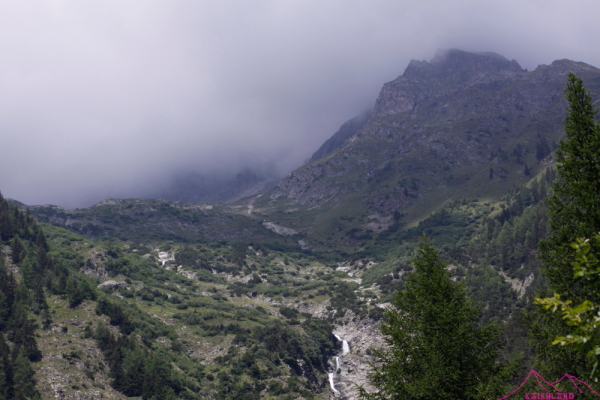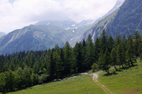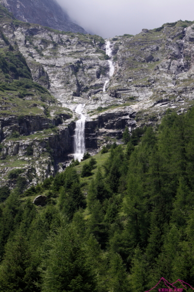 El camino se ensancha, convirtiéndose en una pista forestal entre los abetos y el río al lado, sigo avanzando, hace calor y los pies necesitan descanso, pero prefiero continuar ya no debe quedar mucho. Paso junto a una increíble cascada que cae desde una especie de collado o terraza en la montaña, al lado una pared lisa, creo que de pizarra, dominando el paisaje. En las cumbres todavía quedan neveros o nieve en cantidad, las rocas se mezclan con los pastos y hacen un paisaje maravilloso, el río baja con fuerza, siendo el único sonido que se puede apreciar por encima del resto. De repente oigo un chillido característico de las zonas alpinas, son marmotas, pero tengo los pies cansados como para ir en su busca y tirar algunas fotos; espero poder verlas en los próximos días.