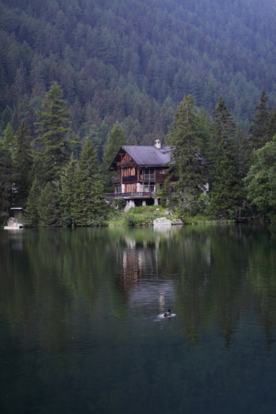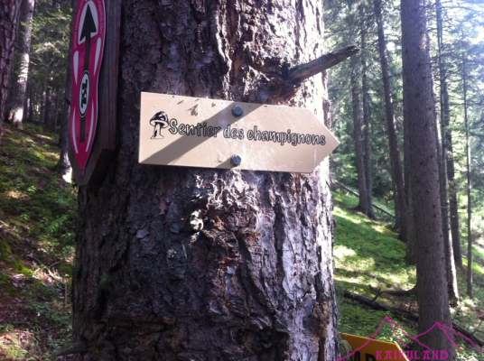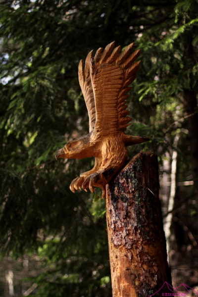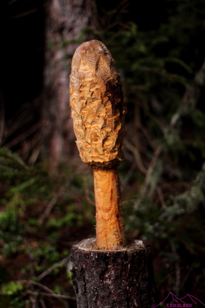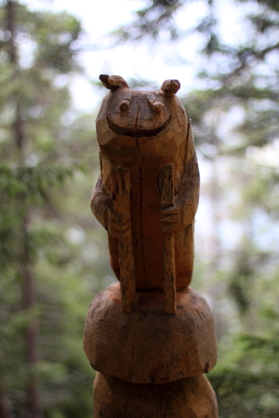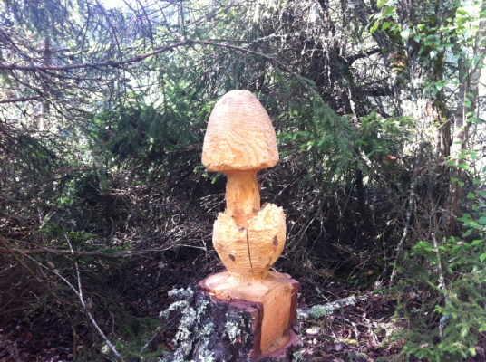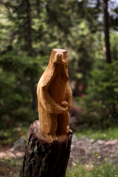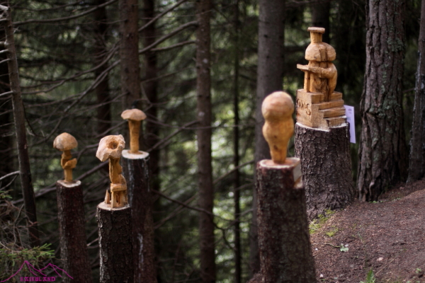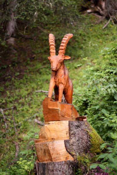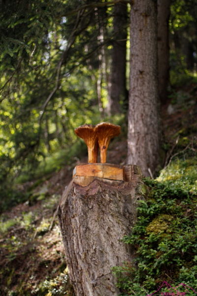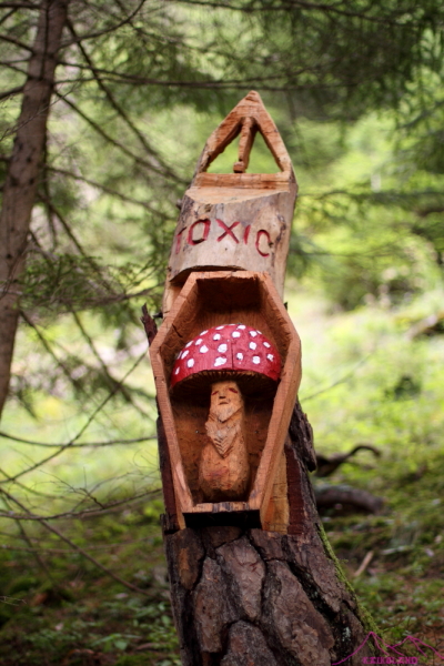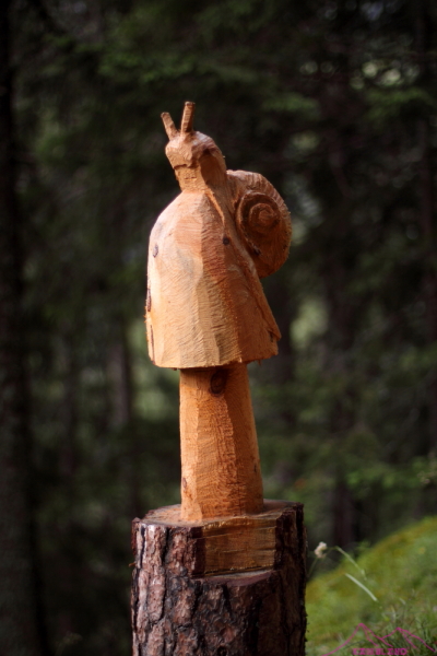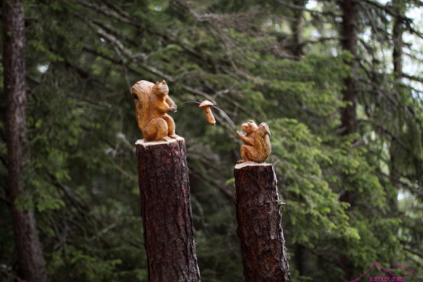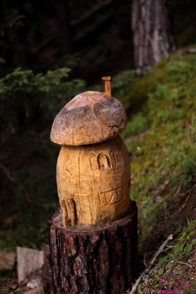 Entre algunas casas se comienza una bajada por un bosque de abetos y alerces donde se puede disfrutar de una senda micológica, evidentemente me he entretenido buscando posibles víctimas estivales para darme un homenaje por la tarde: BOLETUS, pero nada de nada, ni uno, y eso que las condiciones eran perfectas. Lo que si había era multitud de esculturas talladas en los troncos que se habían cortado, aprovechando el mismo árbol para hacer la escultura «in situ»….ardillas, setas, jabalíes y otras igualmente trabajadas y originales, merecía la pena verlas.