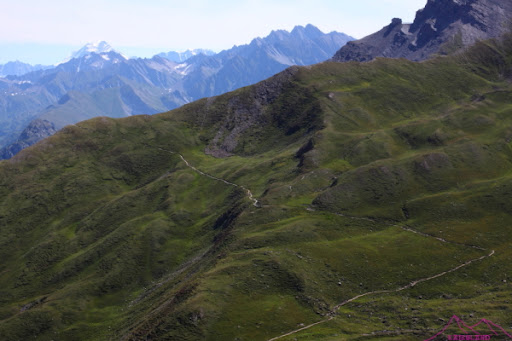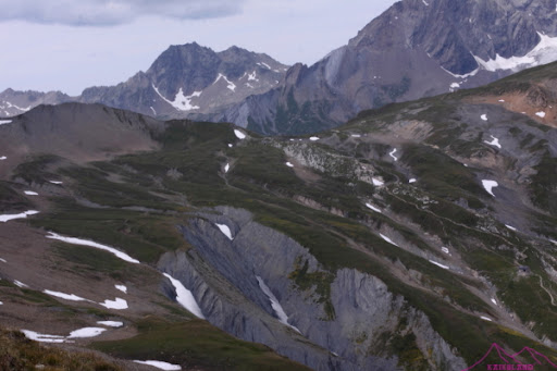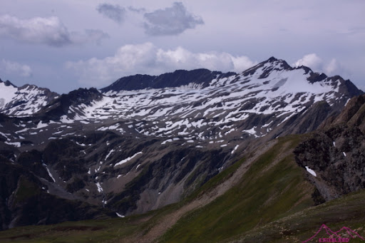Termina la subida y empieza una larga bajada y media ladera con pequeños repechos hasta el Col de Chavannes, pensaba que faltaba poco hasta el coll de Seigne, pero no; aun me queda 1h con una pared larga y descompuesta de pizarra del Mont Lechaud, otra vez cuidado con las piedras y con los pequeños neveros que voy atravesando, «afortunadamente» el tiempo ha cambiado, hay nubes de tormentas y el sol no hará que caigan piedras, lo malo es que empezará a llover…