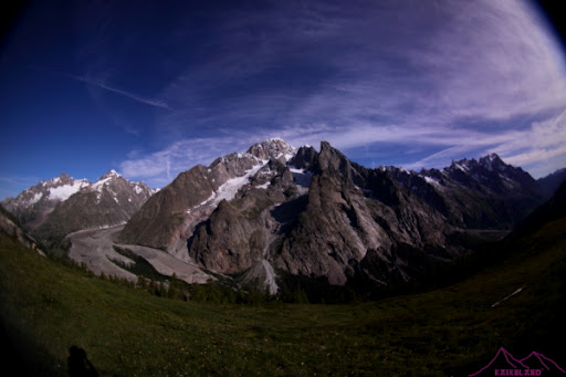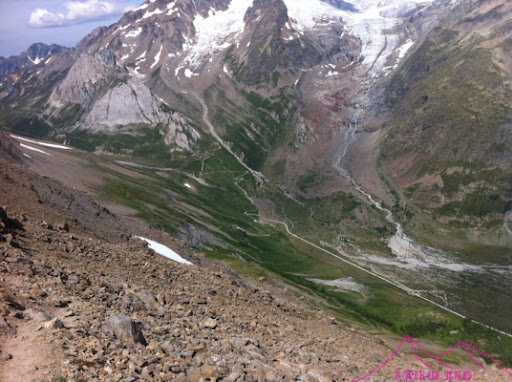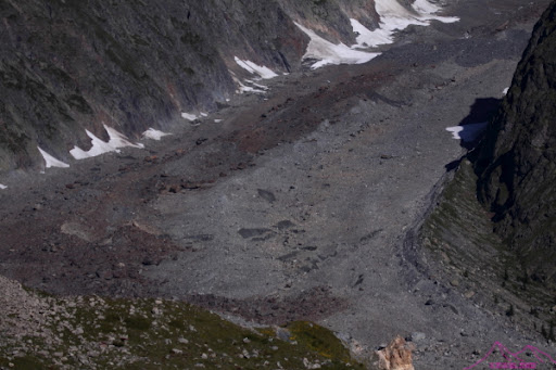 Dejo las fotos, tengo que acelerar, hay mucho camino, alguna subida y muchas pedreras que se van cruzando, a la izquierda paredes de pizarra descompuesta imponen. Después de una bajada, cambio el TMB habitual y lleno de gente por una variante, bastante vertical pero a estas horas asequible, después de ver cómo caen algunas piedras rodando por la pendiente, me pongo en alerta, es un sendero en el que estoy solo y cualquier fallo o accidente sería complicado. Mientras iba por el sendero fácil se veía perfectamente el Monte Bianco, Les Aiguilles Rouges du Breulliard, los glaciares de Frêney, Brouillard y Miage entre otros; ahora lo que veo son rocas y más rocas del Mont Fortin, con sus piedras amenzanates, casi al final de la subida y en el momento más peligroso una pareja de italianos baja, para colmo no dan la preferencia de paso (Ley de la montaña) al que sube, así que se la juego yo y me pongo en el lado de la montaña y ellos pasan por el lado de valle, aéreo…si pasase algo serían ellos los que caerían antes, pícaro si, tonto no…
