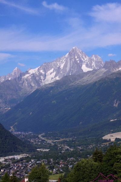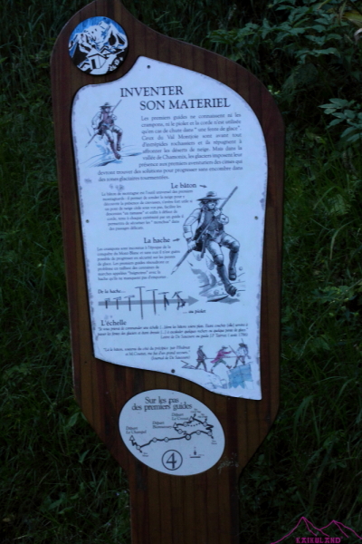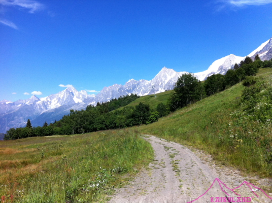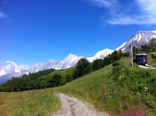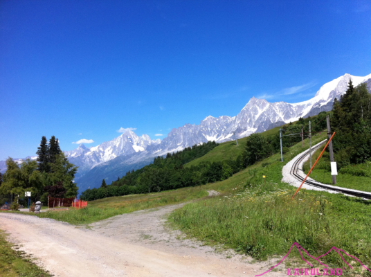 Feliz e ilusionado, sólo me queda bajar a Les Houches, tiro unas fotos, veo, con cierta envidia, el tren cremallera que baja, cojo un sendero de los muchos que hay por allí y me veo en una pista de descenso de bicis de montaña bajando, cuando pasa alguna, me retiro y sigo, no tengo fuerzas para buscar alternativas y a estas horas no pasa casi nadie; de esta manera me quito algunos kilómetros extras que tendría que hacer si bajase por donde pone el mapa, mi rodilla sufre con la verticalidad pero lo agradece en tiempo.