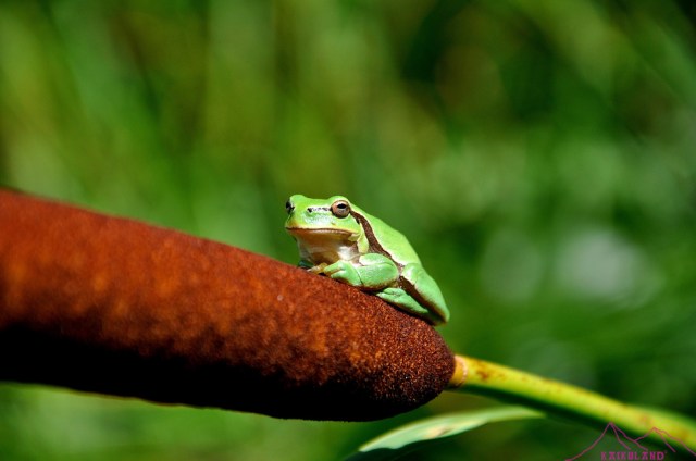 Me encanta la palabra batracio, suena rara, diferente, extraña, complicada, curiosa, y aquí tenemos una más para la colección de ranas de este blog. En este caso una ranita de San Antón posando sobre una espadaña, si esa planta verde con forma de lanza y un puro al final, presente en los humedales y/o charcas de nuestra geografía. En este caso es en el trabajo, una charca artificial que se construyen precisamente para que críen los anfibios entre otras especies.