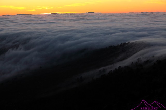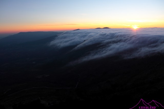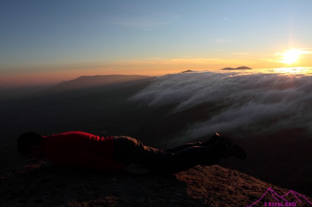 Puse el trípode, cambié el objetivo a uno más de paisaje, para ver la amplitud del efecto que estaban creando estas nubes…Las primeras fotos fueron un planking, una de mis locuras y que ahora hago con asiduidad cada vez que tengo ocasión, sea donde sea, es divertido, luego a compartirlo en Twitter y a disfrutar que la vida son dos días!! Después ya me centré en la puesta de sol, extraña pues se metía por detrás de un mar de nubes, mientras estas bajaba rápidamente por la vertiente madrileña, hacia Guadarrama y los Molinos, desde el cordal que separa el Alto del León con la Peñota y ocupaban toda la parte segoviana cubriéndola al completo, como una masa uniforme y densa. disparos, disparos y más disparos, buscando las fotos, los detalles, la amplitud del efecto de esa cascada de nubes tan peculiar y bastante habitual en la Sierra de Guadarrama, al menos por esta zona.