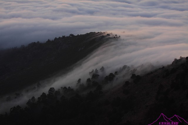 Volviendo del trabajo, al cruzar de Cotos a Navacerrada, de camino a Cercedilla donde vivo pude ver que en segovia había nubes bajas que creaban ese magnífico efecto que es el «mar de nubes»…yo conduciendo y buscando un lugar donde parar para hacer fotos, aunque todavía era pronto y la luz era mala, por lo menos para llevarme la imagen de recuerdo…pero es imposible, tiene pocas zonas para parar y no tuve oportunidad….seguí mi camino y al bajar el puerto de Navacerrada pude comprobar que esas nubes también estaban al otro lado del Alto del León, y pasaban, para desaparecer, a la vertiente madrileña…llegué a casa, cambié la mochila, me cambié de ropa y me puse las zapatillas de correr…quería ir a buscar LA FOTO, si esa foto que imaginas que vas a tener en tales condiciones de nubes y puesta de sol.