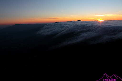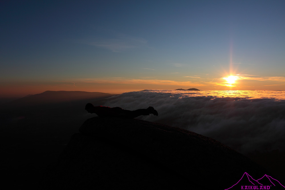 Puse el trípode, cambié el objetivo a uno más de paisaje, para ver la amplitud del efecto que estaban creando estas nubes…Las primeras fotos fueron un planking, una de mis locuras y que ahora hago con asiduidad cada vez que tengo ocasión, sea donde sea, es divertido, luego a compartirlo en Twitter y a disfrutar que la vida son dos días!! Después ya me centré en la puesta de sol, extraña pues se metía por detrás de un mar de nubes, mientras estas bajaba rápidamente por la vertiente madrileña, hacia Guadarrama y los Molinos, desde el cordal que separa el Alto del León con la Peñota y ocupaban toda la parte segoviana cubriéndola al completo, como una masa uniforme y densa. disparos, disparos y más disparos, buscando las fotos, los detalles, la amplitud del efecto de esa cascada de nubes tan peculiar y bastante habitual en la Sierra de Guadarrama, al menos por esta zona.