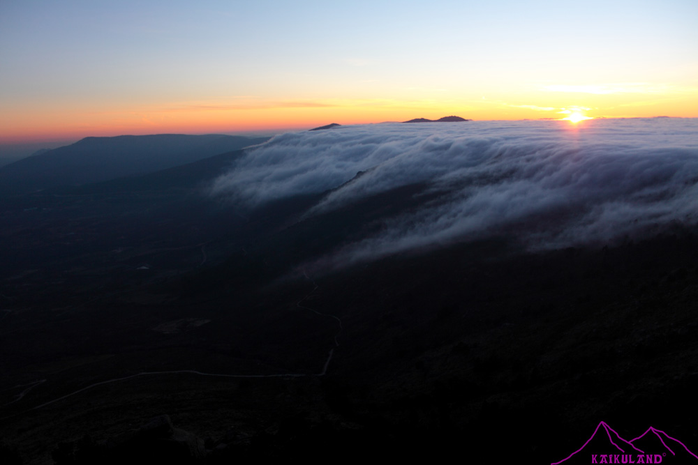 Volviendo del trabajo, al cruzar de Cotos a Navacerrada, de camino a Cercedilla donde vivo pude ver que en segovia había nubes bajas que creaban ese magnífico efecto que es el «mar de nubes»…yo conduciendo y buscando un lugar donde parar para hacer fotos, aunque todavía era pronto y la luz era mala, por lo menos para llevarme la imagen de recuerdo…pero es imposible, tiene pocas zonas para parar y no tuve oportunidad….seguí mi camino y al bajar el puerto de Navacerrada pude comprobar que esas nubes también estaban al otro lado del Alto del León, y pasaban, para desaparecer, a la vertiente madrileña…llegué a casa, cambié la mochila, me cambié de ropa y me puse las zapatillas de correr…quería ir a buscar LA FOTO, si esa foto que imaginas que vas a tener en tales condiciones de nubes y puesta de sol.
