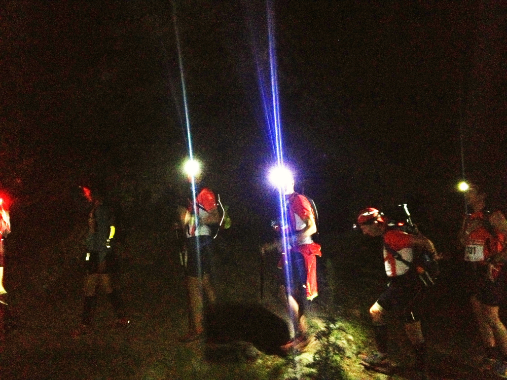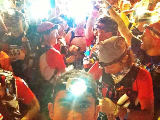 No sé cuantos cientos de personas salimos de alli en dirección a la Maliciosa, primeras risas, comentarios, pista de tierra (polvo, polvo y más polvo…) hasta llegar a la Barranca donde se inicia la subida a la Maliciosa, allí la muchedumbre se transformó en una línea de a uno, luces blancas y rojas (traseras) iluminaban de una manera especial la subida a la primera cumbre, sendero primero sobre tierra y luego sobre piedras sueltas, lo bueno era saber por dónde iba, todo ese camino hecho tantas y tantas veces para ver amanecer, con clientes como guía, con amigos…en fin, muy conocido pero con el problema de tener que ir detrás de mucha gente sin poder adelantar, aunque sabía que quedaba y no sería bueno precipitarse… Al llegar al collado del Piornal, encontrarme con un amigo, animando junto con más personas fue algo fantástico, sensación maravillosa y que te hacía volar….y seguir esa serpiente de luces que, al llegar a la cumbre continuaba dibujándose hasta Cantochino, demostrando así los diferentes niveles de corredores que estábamos allí…