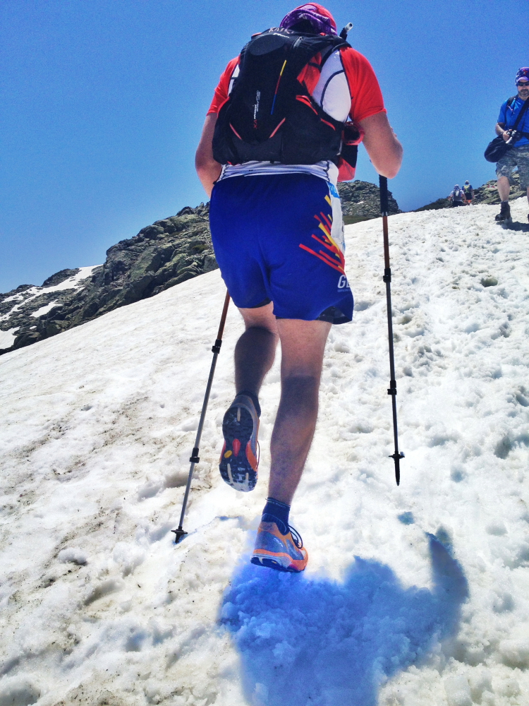 Sin darme cuenta iba cogiendo forma, iba perdiendo esos kilos sobrantes de las navidades y mi cabeza comenzó a pensar en el #GTP2013, me estaba dando cuenta que tanta travesía me vendría muy bien para poner a tono las piernas y poder plantearme hacer la carrera aunque me tuviese que abandonar en el km 15 o 20. Pasaron los días, las semanas, los meses y yo seguía esquiando, todavía había nieve y se podía bajar, al menos, entonces ya tocaba subir una parte andando y otra con travesía hasta que al final subía en zapatillas y descendía las palas de Peñalara esquiando para volver corriendo a Cotos con el equipo y en zapatillas. Mi fondo físico había mejorado mucho, mis piernas estaban fuertes aunque apenas había corrido, necesitaba hacerlo ya que el esquí no carga tanto las rodillas como el golpeteo continuo de la carrera….y conseguí hacer unas salidas, alguna con @zampus y @69vagamundos, esos dos grandes amigos que en su día me picaron y yo no me eché atrás… hice un par de salidas largas de no más de 40km puesto que me había dedicado a esquiar!!! Me sentía algo asustado por lo que pudiese sufrir al correr una distancia tan larga sin haber entrenado lo suficiente; además tenía ligeras molestias en el bíceps femoral y de ciática por no estirar convenientemente y, para colmo, me caí esquiando un par de semanas antes de la carrera torciéndome la rodilla, por lo que estaba pensando que sería imposible acabar una carrera en esas condiciones. La semana previa a la carrera volví a esquiar para probar la rodilla y a andar/trotar con @zampus para reconocer el tramo de Rascafría a Peñalara, después 4 días de descanso para la carrera.