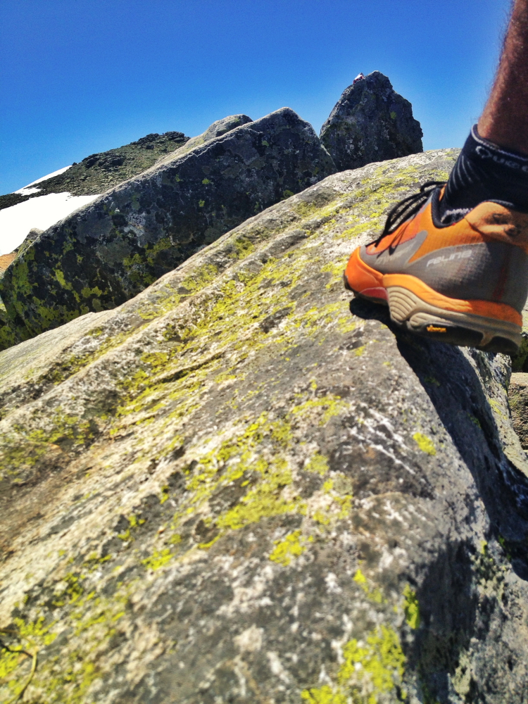 El cordal que hay entre el puerto del Reventón y la cima de Peñalara es sencillo, salvo el último tramo del risco de los Pájaros y la cresta de Claveles, hasta allí vas en un paisaje precioso de piornos en flor (amarillas) y praderas de altura, sendero fácil, con algunas subidas y bajadas nada complicadas. Ya en la laguna de los Pájaros toca subir una buena pendiente, atravesamos un pequeño nevero y toca un tramo de trepada por rocas algo más grandes del risco de los Pájaros, vamos muy bien de ritmo y esa zona es de mis favoritas ya que llevo por Peñalara todo el invierno/primavera, le tengo especial cariño a este tramo de la carrera. Las zapatillas van muy bien en este terreno, la suela Vibram hace honor a su historia y calidad, agarrando perfectamente,permitiéndome trepar sin problemas por todas las piedras, convirtiéndose en un baile por las piedras, disfrutando como un niño por las piedras a pesar de las horas que llevamos de carrera.