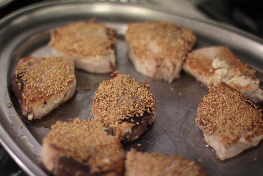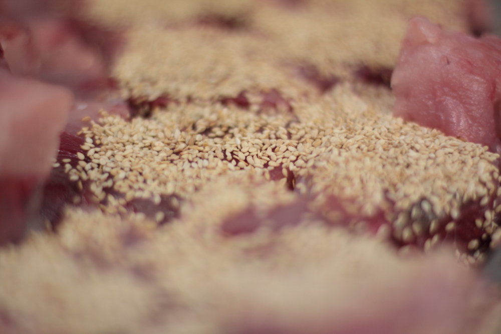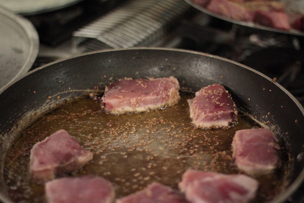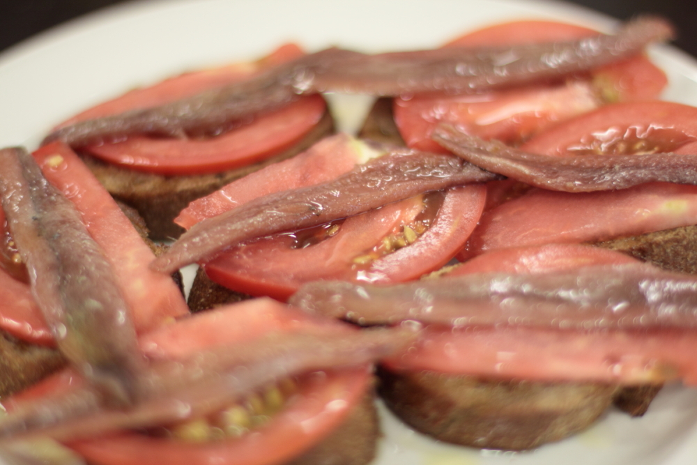 Marta y Matteo dispusieron sobre la mesa una variedad de exquisitas conservas: filetes de anchoa del Cantábrico, bonito del Norte del Cantábrico, Ventresca, pasta de anchoa, acompañando también con tomate natural del país aderezado con Aceite de Oliva Virgen Extra de @iloveaceite. Matteo se encargó de preparar uno de los bonitos que había comprado en la subasta de la mañana, con una receta, sencilla pero deliciosa de lomo de bonito a la plancha con semillas de sésamo y la ventresca al horno.